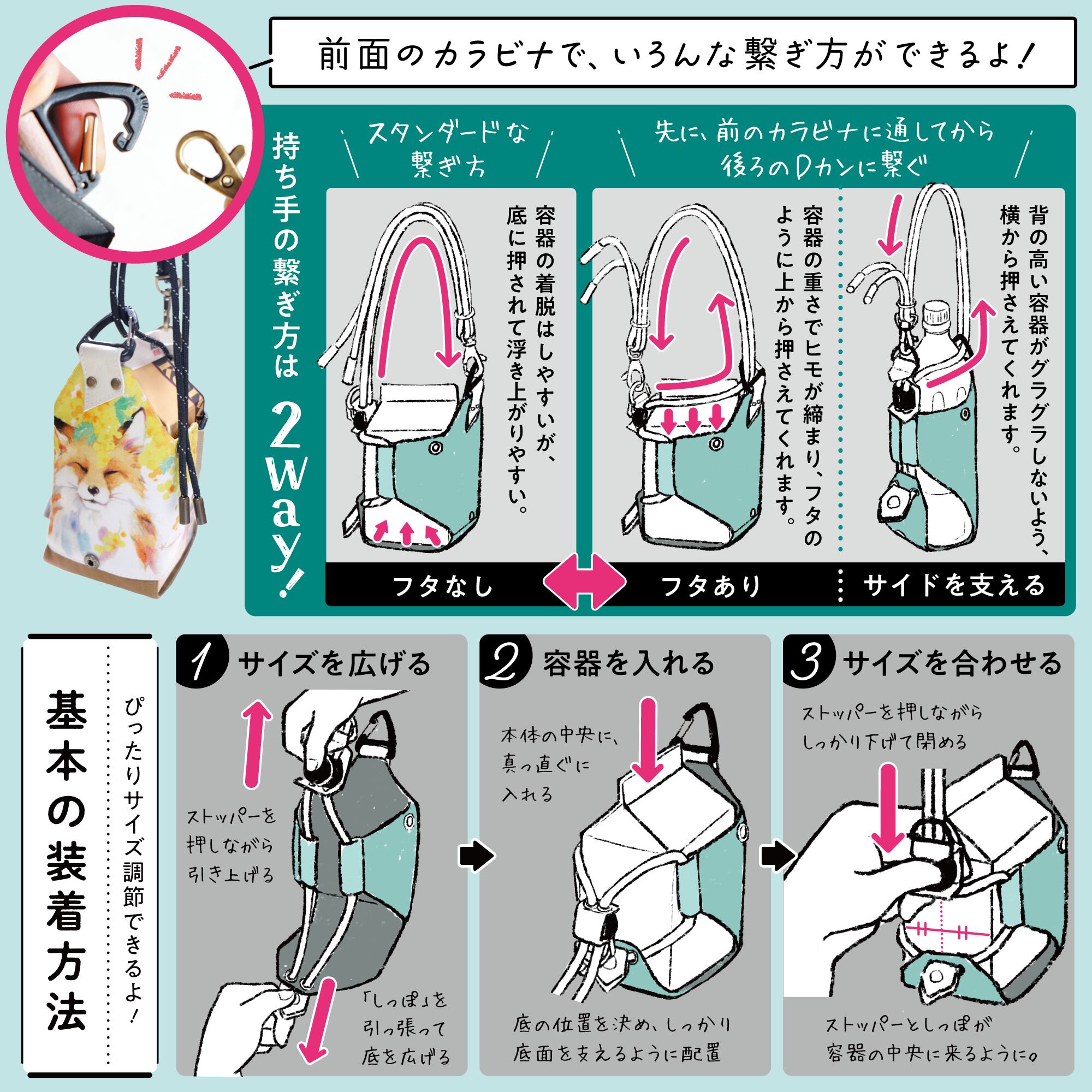 ※いずれの場合も、中に入れるものが大きいほど持ち手ヒモは短くなります。