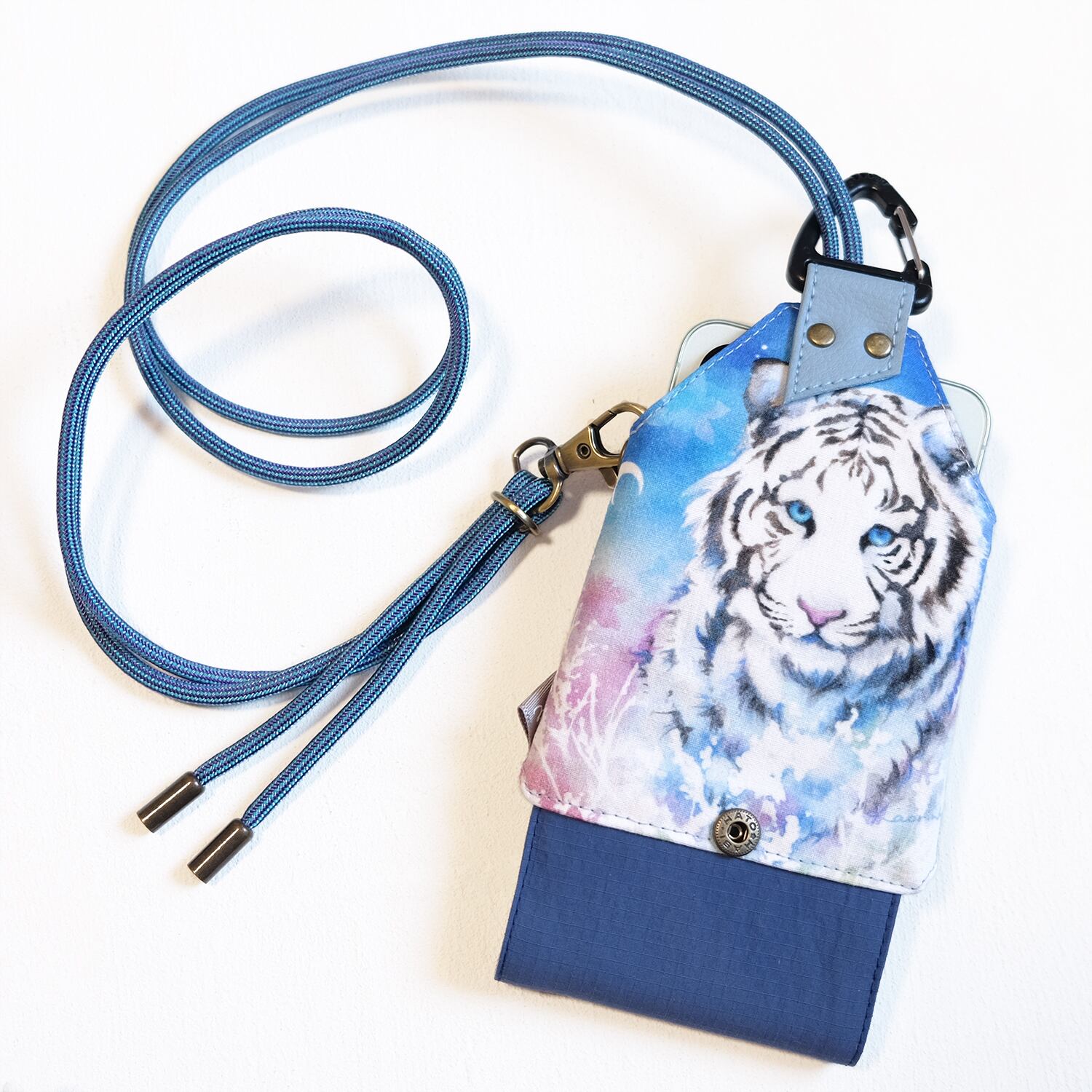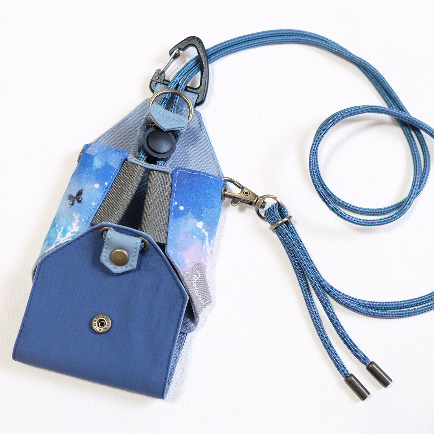 写真では分かりにくいのですが、実は水色とパープルの2色の色が織り込まれた、ちょとギラっとした珍しいパラコードを輸入して使用しています。