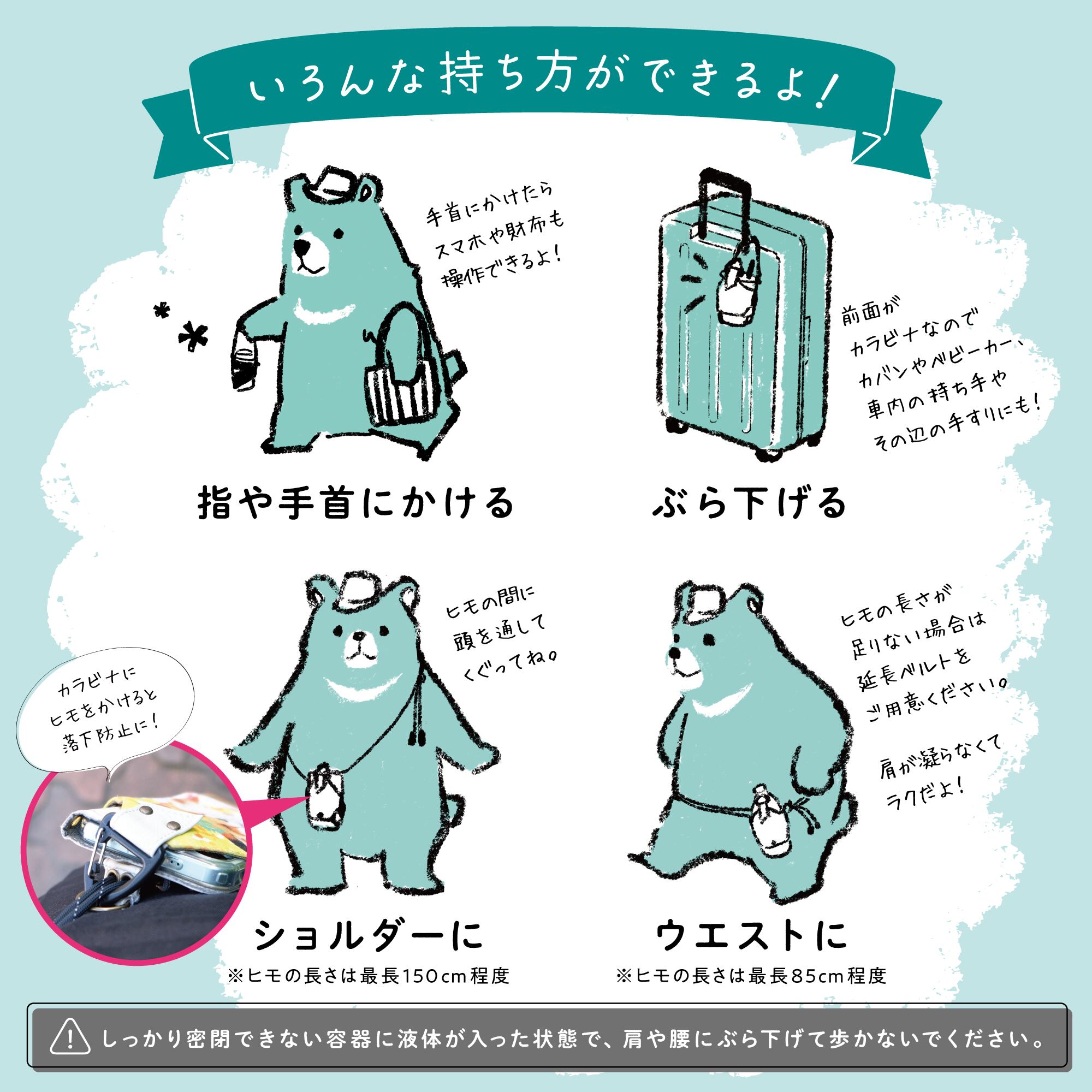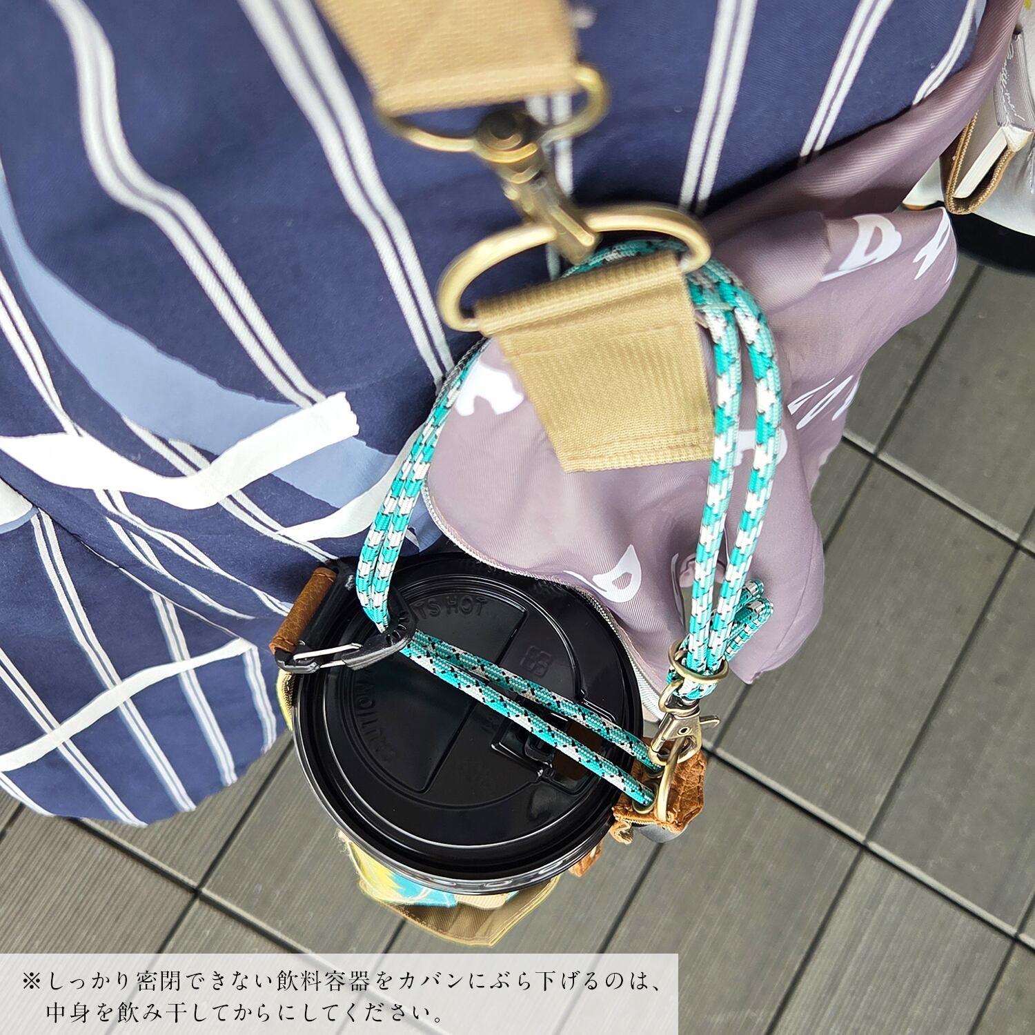 ※カップドリンクや封を開けた缶飲料など、しっかり密閉できない容器に液体が入った状態では肩や腰にぶら下げたり、カバンにぶら下げて使用しないでください。歩行時の振動により、中身が溢れる危険性が高くなります。