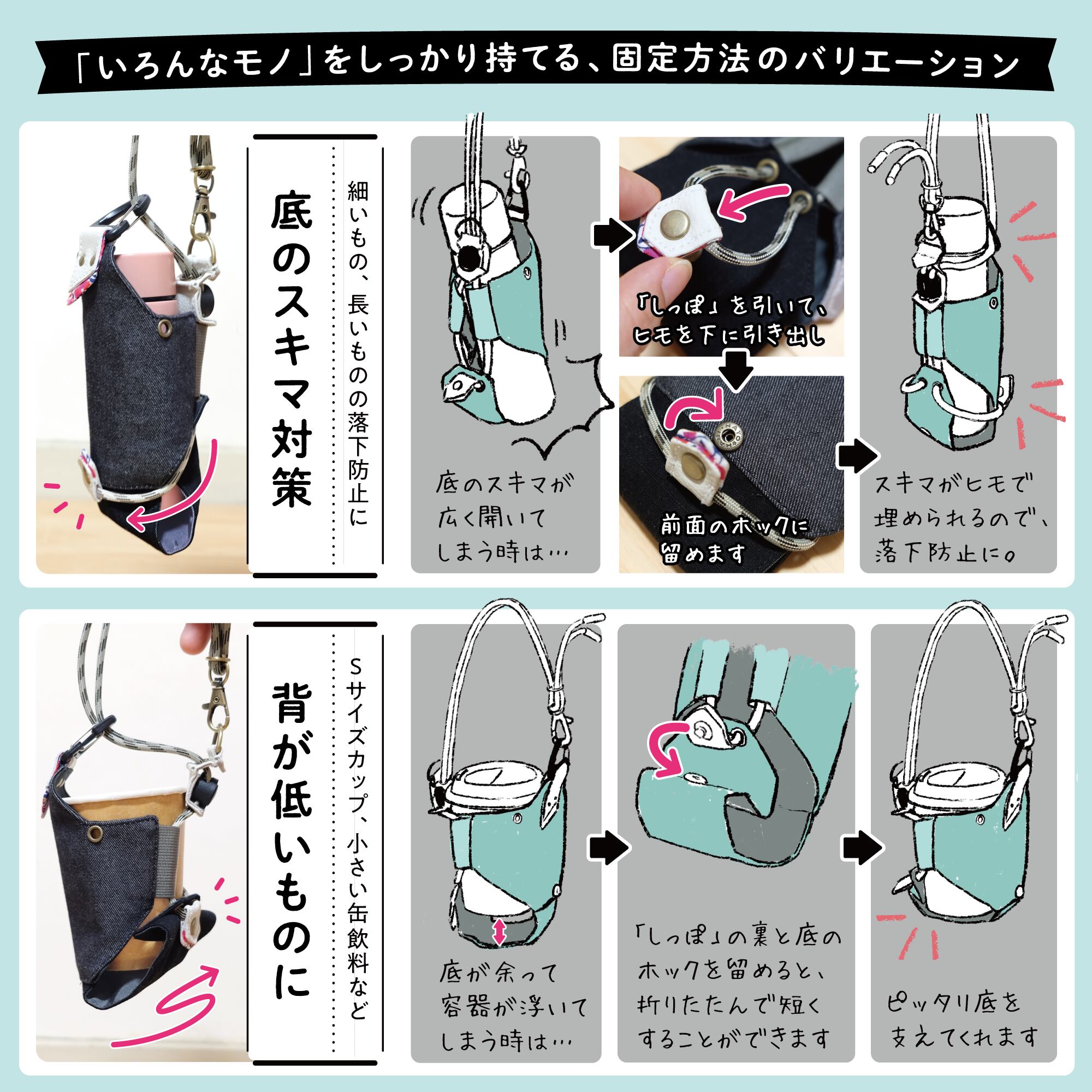 ※いずれの場合も、中に入れるものが大きいほど持ち手ヒモは短くなります。